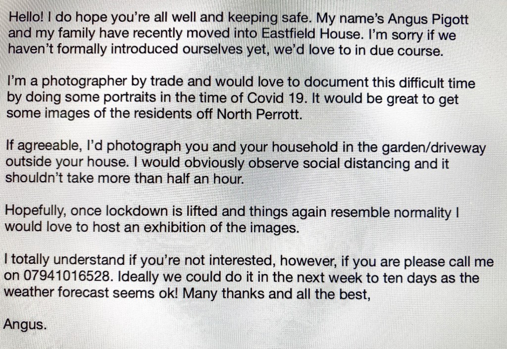 Angus Pigott moved into Eastfield House with his wife and three young children in 2019. In 2020 we went into lock-down and like many people who are self employed, his work as a professional photographer pretty much dried up.