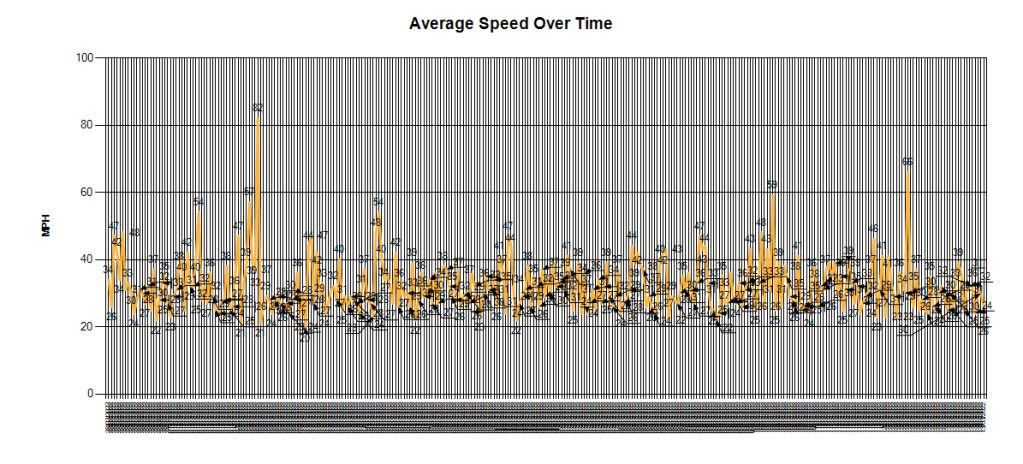 The average speed over the first fortnight was 31mph. It was also 31mph over both week’s individually. However, daily averages do change slightly, as shown in the first graph. At the moment there is no indication that traffic is faster on any particular day, but this graph may give the community speedwatch group a day to target in the future. The second graph is the average speed by hour. This graph is a little too crowded to decipher using a fortnight’s data but by focusing on just 24hrs, the graph shows clearly that most cars maintain the speed limit between the hours of 9am and 5pm. Outside those hours, speeds are generally faster.