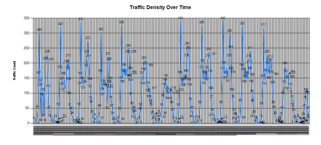Last but not least, the graph showing traffic density over time shows a very similar pattern every day. Traffic flow is greatest at between 8am and 9am in the morning (the high peak). Traffic volume slows during the day and builds up over an extended period between 4pm and 6pm in the afternoon (the second peak). Traffic flow drops to almost zero between 11pm and 6am (the deep trough). This pattern is repeated every day and only drops on Saturday and more on Sunday. The next week is a repeat of the same pattern.