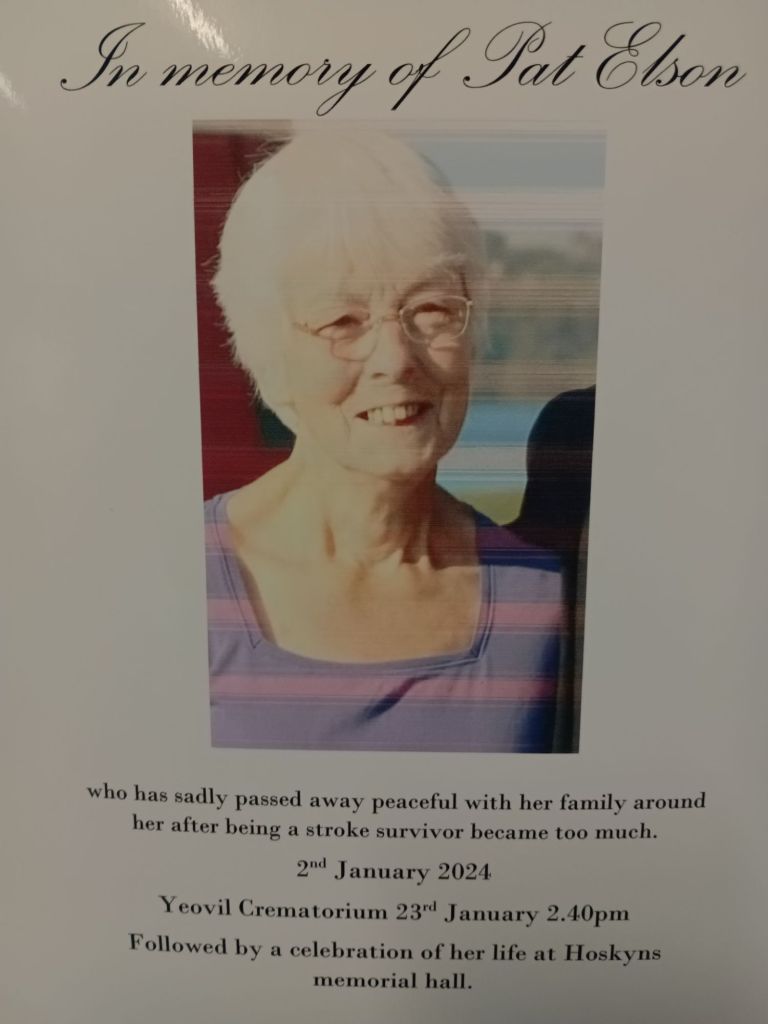 Pat’s funeral will be on 23rd January, 2.40pm at Yeovil Crematorium.